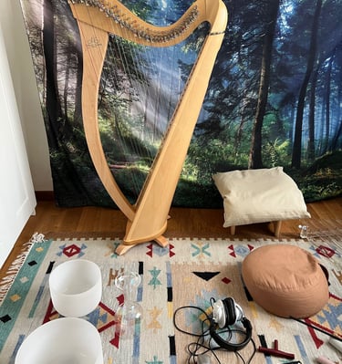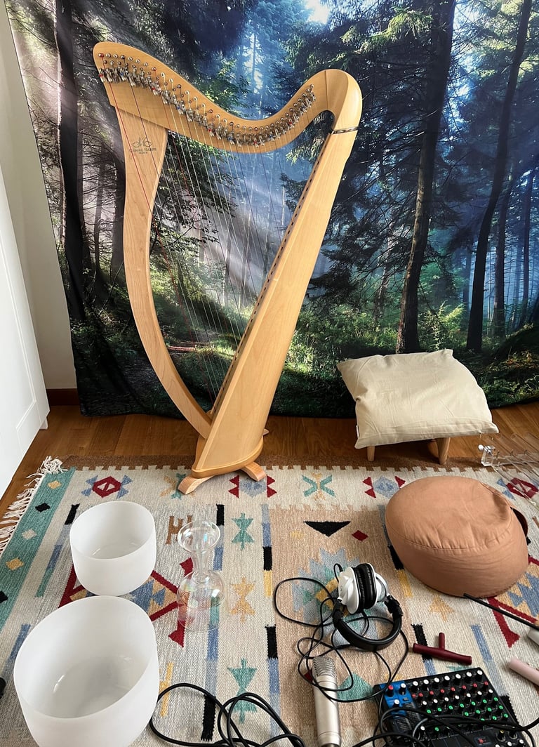 La mia voce e il suo intreccio con gli strumenti dall'alto valore terapeutico come le campane e arpa di cristallo (432 Hz), l'arpa celtica e suoni elettronici specifici crea un ambiente sonoro rigenerante e riequilibrante.